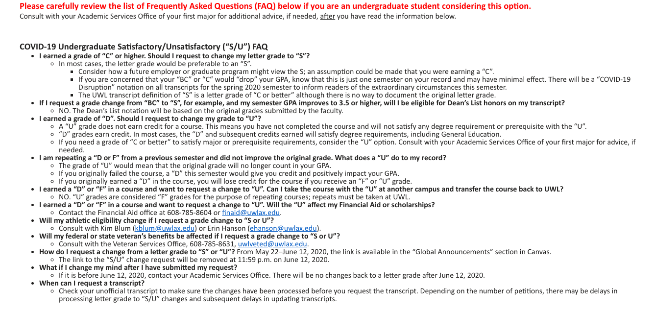 UWL Records & Administration registrar emailed UWL students Jan Von Ruden on May 21 at 12:15 p.m. the office emailed frequently asked questions (FAQ) with answers for UWL students to consider before petitioning to change the grade to an S/U.