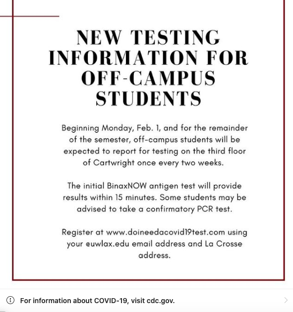 The University of Wisconsin La Crosse Student Association released a statement on their Instagram [@uwlstudentassociation] today, Jan. 31, regarding new testing expectations for students.