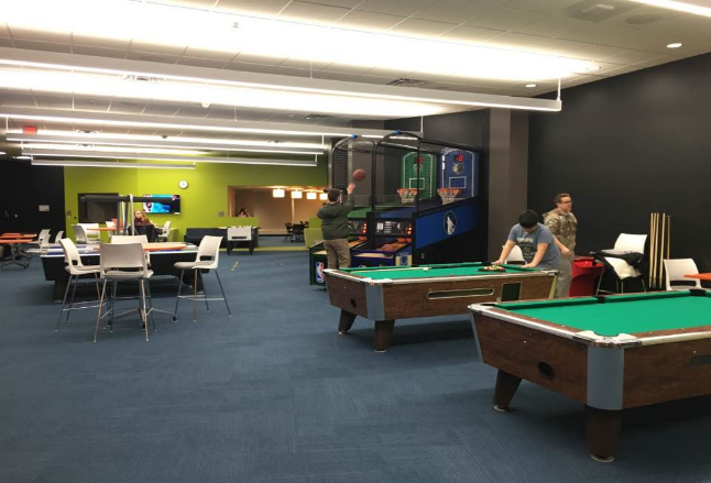 Heading downstairs, The U has a lot of entertainment options available to students free of charge. It features pool tables, arcade basketball, air hockey, foosball, big TVs and even a full movie theater. McCarville stated, “The U is definitely a more social and inviting environment compared to Cartwright. I also like how they included a lot of communal and social areas where students can more easily mingle. They even have big balconies to hang out on above campus.”