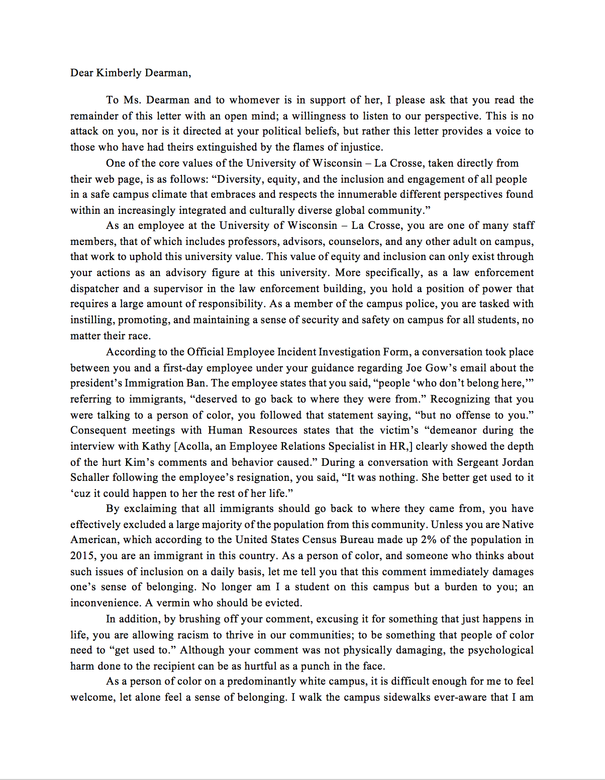 Dearman was notified of her termination on March 13, 2017, by the UW-L Human Resources Department for comments she made towards a student employee on Feb 1, 2017. In the official investigation, Dearman is quoted supporting the Trump travel bans stating, “Immigrants don’t belong here,” before telling the student, who is of Asian descent, “No offense to you.”