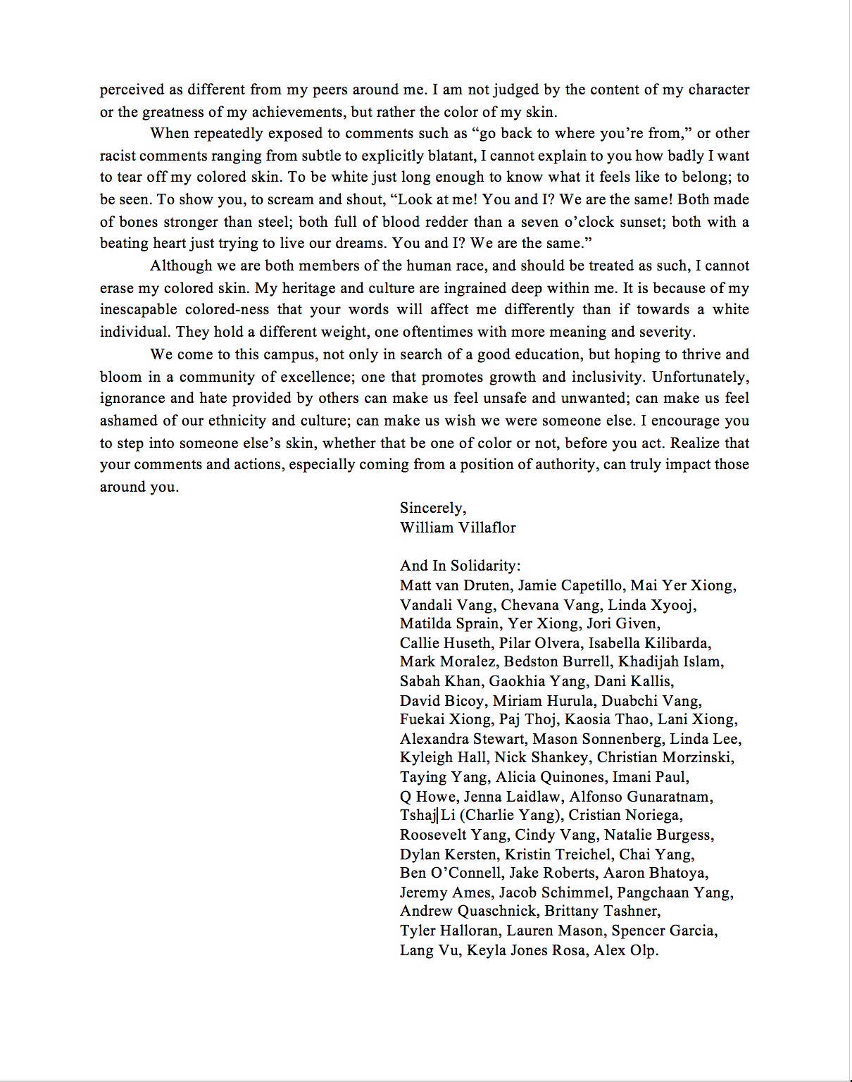 According to a response letter signed by nearly 60 UW-L students “We come to this campus, not only in search of a good education, but hoping to thrive and bloom in a community of excellence… Unfortunately, ignorance and hate provided by others can make us feel unsafe and unwanted; can make us feel ashamed of our ethnicity and culture [and] can make us wish we were someone else.”