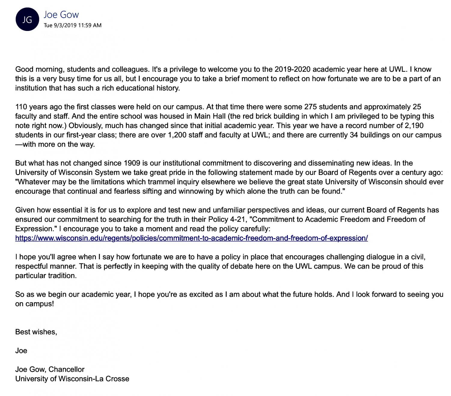 “Welcome to our 110th Academic Year,” reads the tagline of one of the University of Wisconsin-La Crosse Chancellor Joe Gow’s emails. Sent to students on Sept. 3, 2019, the email served the dual purposes of being a homecoming welcome and an update on the evolution of school statistics, including the number of students, faculty, and buildings since the University’s beginning in 1909, as well as a reminder of an age-old University vision statement: