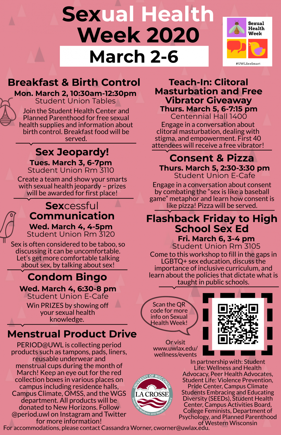 Wellness and Health Advocacy and the Peer Health Advocates are again coordinating Sexual Health Week for students at UWL. Sexual Health Week is a full week of events centered around sexual health education, and features presentations on birth control options, sexual health trivia, sexual communication, clitoral masturbation, consent, and gaps in sexual health education for high school students, particularly for LGBTQ+ students.