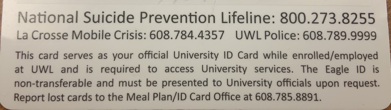 The University of Wisconsin-La Crosse has had the contact information on the student identification cards since Fall 2019. UWL dining plan and Eagle ID specialist Carol Dejno said, “After discussion, the idea was brought before student senate. [Student senate] had some input about the format and what other phone numbers could have been put on because we put on UWL police and the La Crosse mobile crisis.”