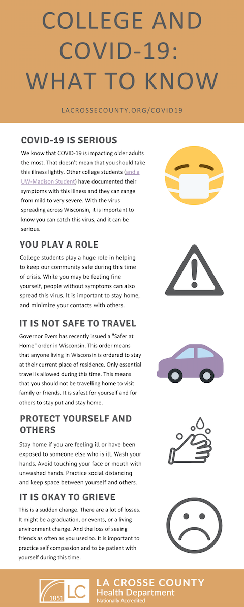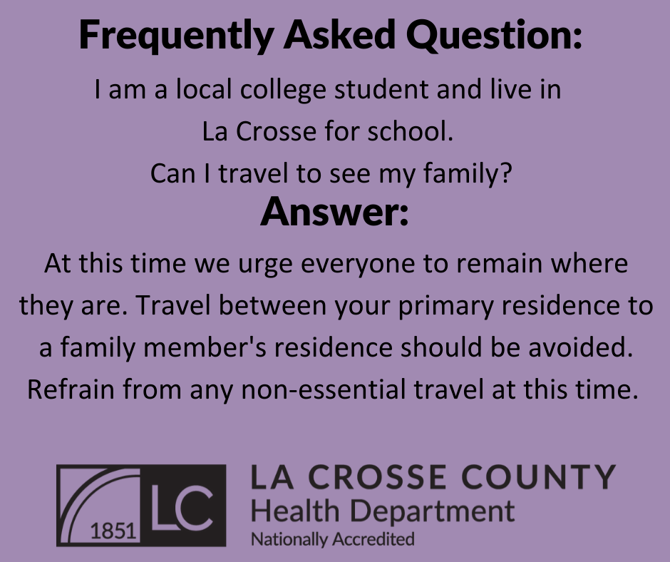The La Crosse County Health Department advises that all students stay at their primary residence and avoid all non-essential travel. Essential travel means going to get a prescription, the grocery store, the hospital, etc. All we have to do is stay in one place, and with the era of technology we have, it is now easy to spend virtual time with others. Although this is an adjustment, not following protocol only puts yourself and others at risk.